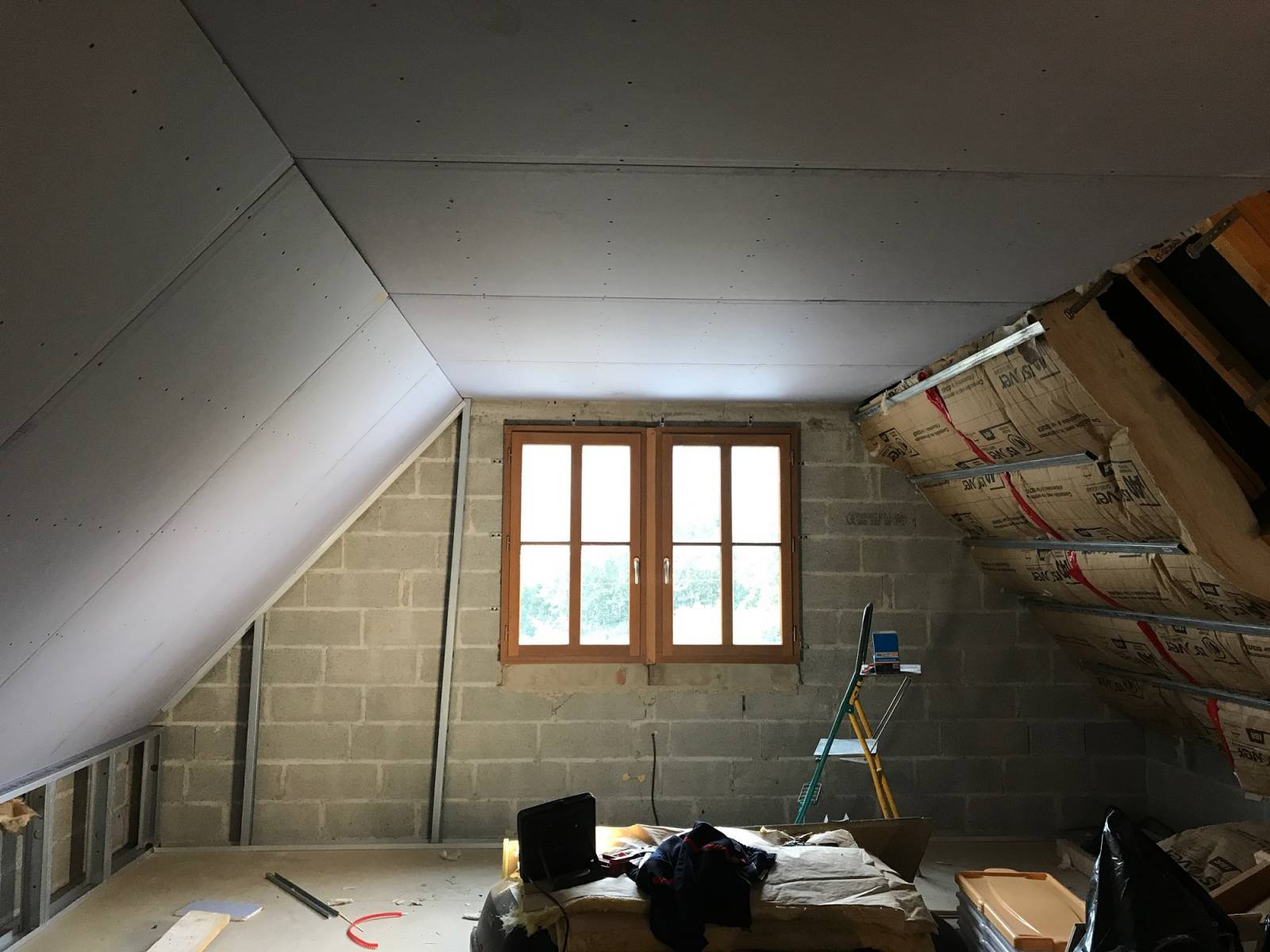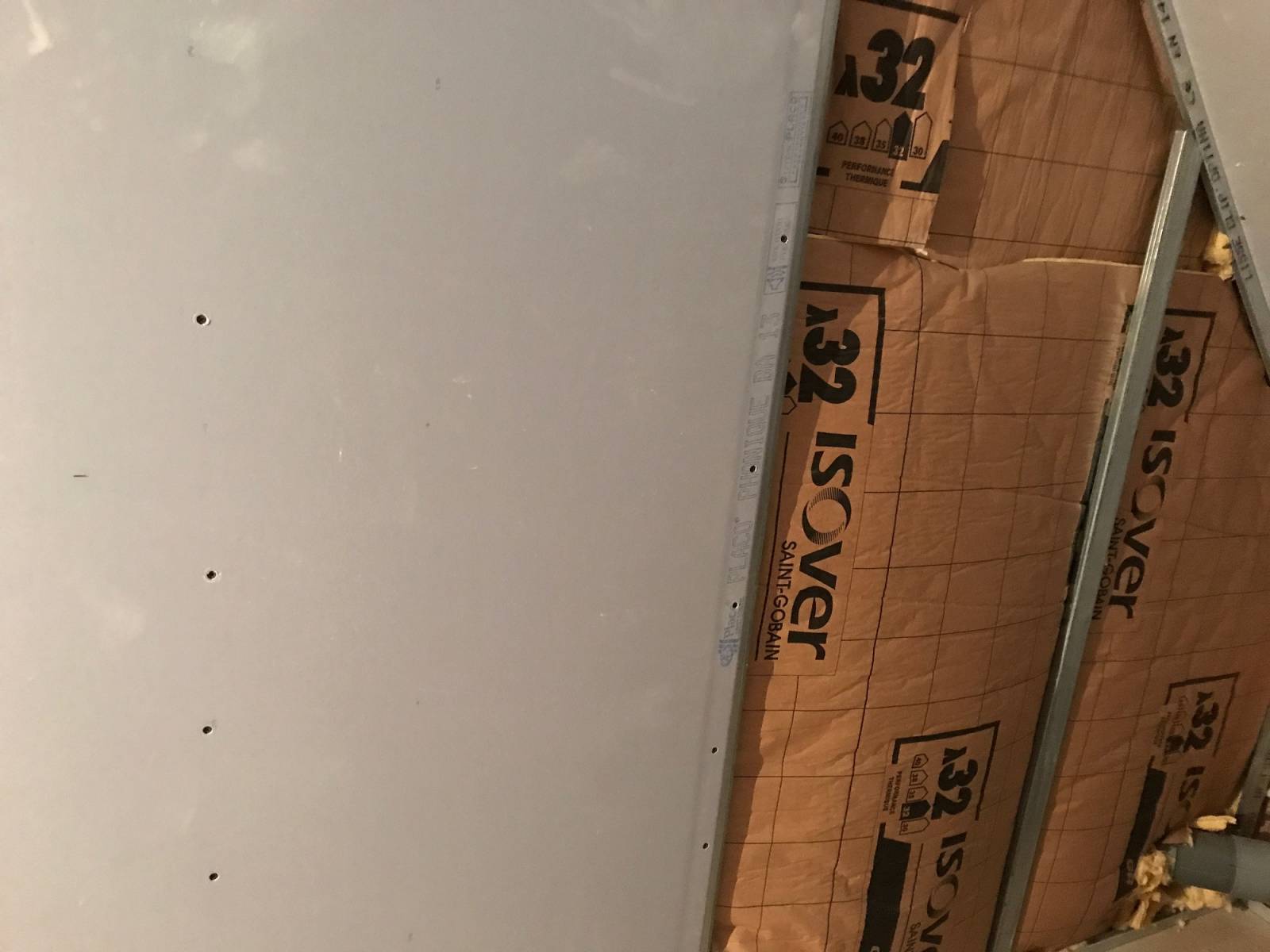 Pour une création de nouvelles pièces sous les toits d'une habitation sur le département de la Seine-Maritime 76, nous avons réaliser une isolation des murs et des rampants avec de la laine de verre avec pare vapeur inséré sur des montants aluminium et recouvert de plaque de plâtre phonique.