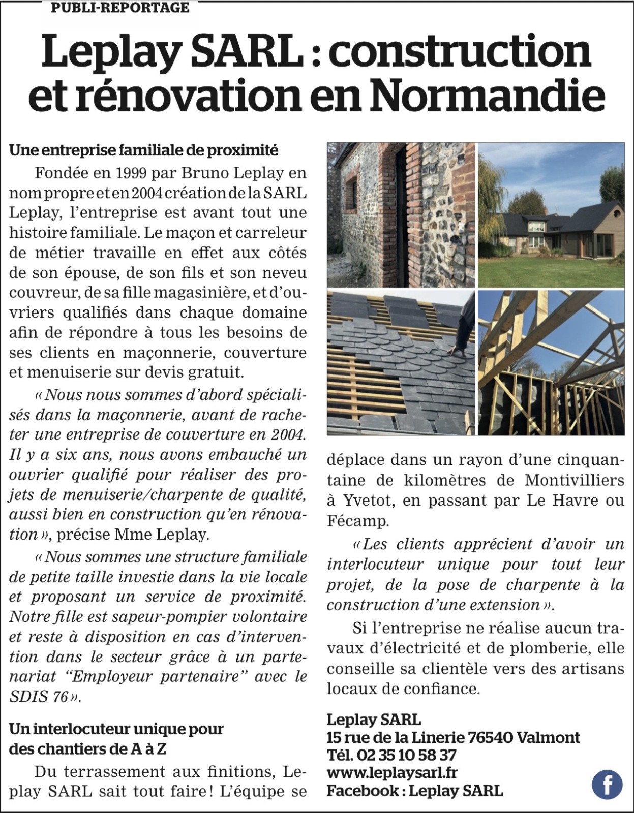 Nous avons eu l’occasion de faire un beau reportage dans le Courrier Cauchois du mois de mai 2025 afin de mettre en avant notre entreprise leplay SARL afin de faire connaître aux clients comment nous travaillons et comment sont constitués nos équipes.